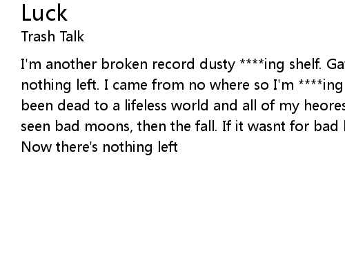 | I'm another broken record dusty ****ing shelf. Gave it all I had an now theres nothing left. I came from no where so I'm ****ing destined for nothing. I've been dead to a lifeless world and all of my heores are here in the dirt. I've seen bad moons, then the fall. If it wasnt for bad luck i'd have no luck at all. Now there's nothing left |