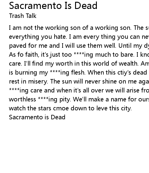 I am not the working son of a working son. The sun? it never shined on me. I am everything you hate. I am every thing you can never be. These city streets were paved for me and I will use them well. Until my dying day I'm burning ni hell. As fo faith, it's just too ****ing much to bare. I know the world could never care. I'll find my worth in this world of wealth. Amidst the struggle, the sun is burning my ****ing flesh. When this ctiy's dead we'll all go underground to rest in misery. The sun will never shine on me again. The world could never ****ing care and when it's all over we will arise from the ashes of your worthless ****ing pity. We'll make a name for ourselves, by ourselves, we'll watch the stars cmoe down to leve this city. |