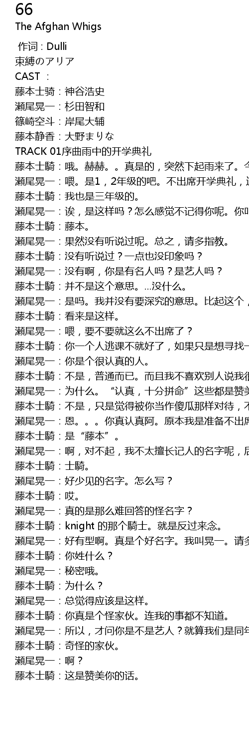 | [00:07.672] | 藤本士騎:哦。赫赫。。真是的,突然下起雨来了。今天的降雨率是80%吧,这么急冲冲的跑出来,连伞都忘了带。哎,今天是我高中生活中的第5次开学典礼了吗?没想到,会变成我独自一人来学校参加,明明是我一直期待的事。真得来临了,却不怎么想去了。我究竟在想些什么呀。。。 |