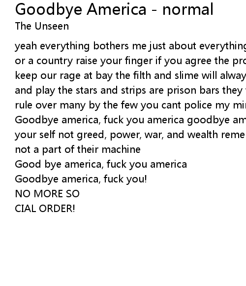 Goodbye america, fuck you america goodbye america, fuck you! pledge allegence to your self not greed, power, war, and wealth remember you were born a human being not a part of their machine |