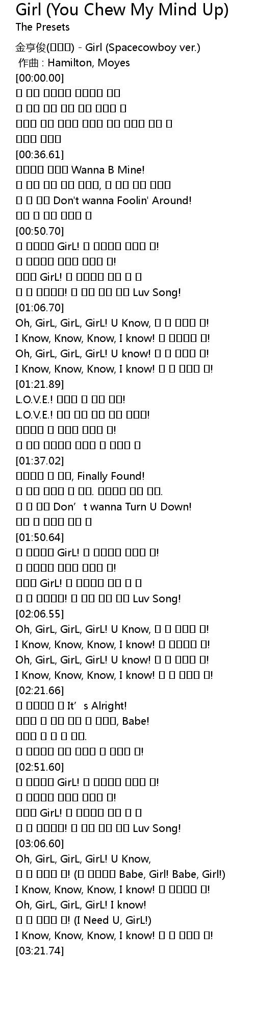 | [02:06.71] | Oh, GirL, GirL, GirL! U Know, 넌 내 전부인 걸! |
