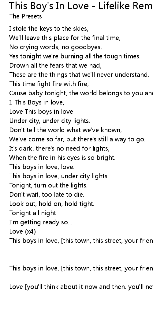 This boys in love, [this town, this street, your friends, you'll never see this place again, ]