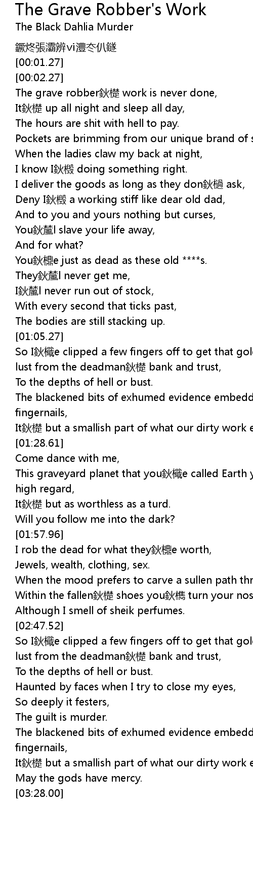 | [00:20.06] | The grave robber鈥檚 work is never done, |