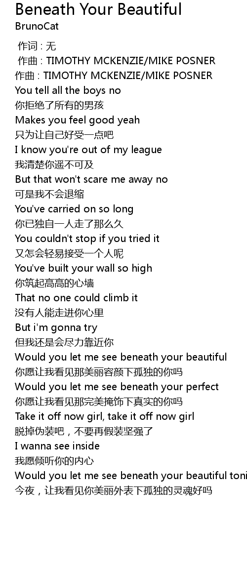 | [01:14.456] | Would you let me see beneath your beautiful tonight |