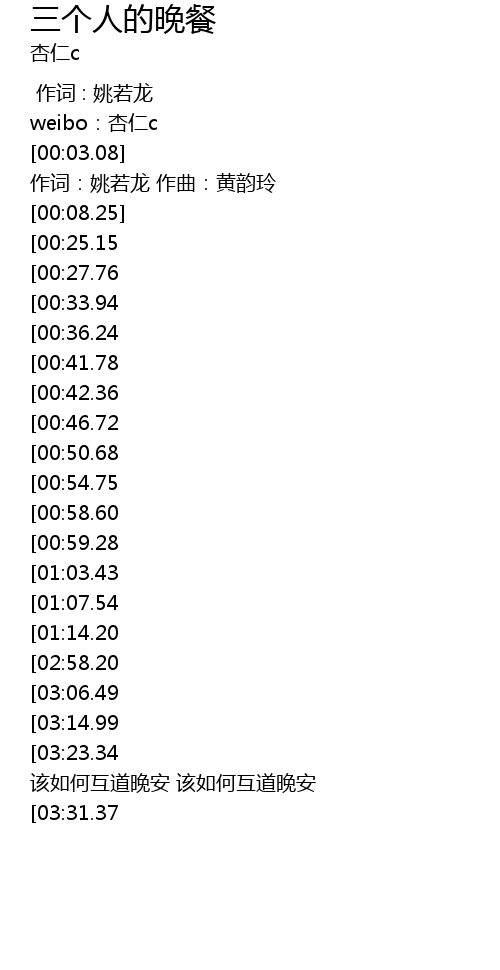 | [03:32.22][02:58.20][01:16.25] | 三个人的晚餐 没有人开口交谈 |