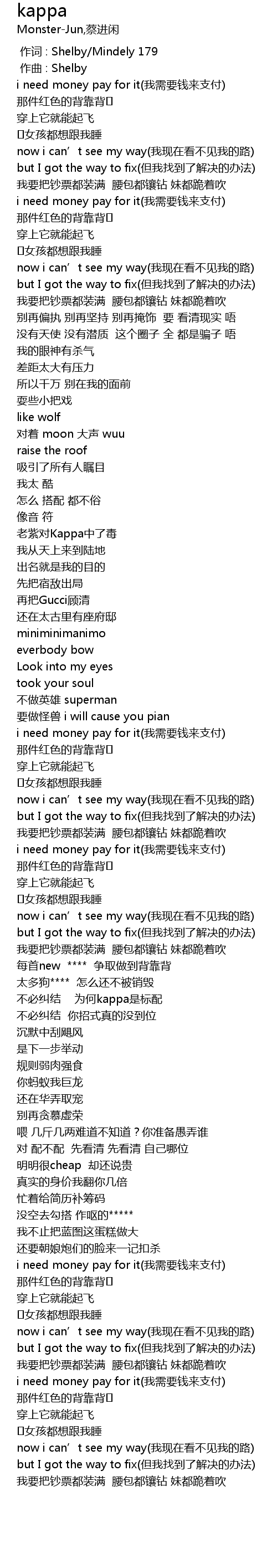 | [02:32.797] | 我要把钞票都装满 腰包都镶钻 妹都跪着吹 |