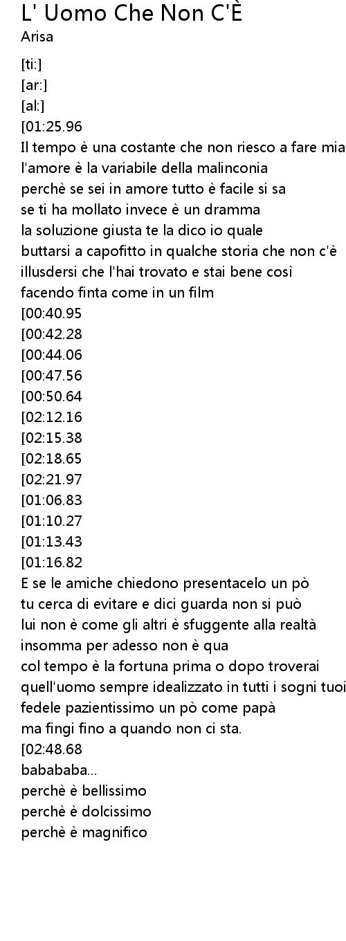 | [02:35.10][01:16.82] | e duro ammettere che lui in realta non c'e |