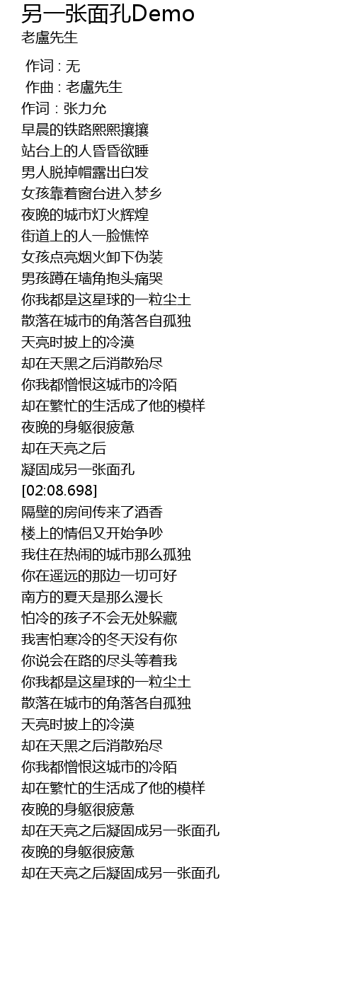 | [02:00.448] | níng gù chéng lìng yī zhāng miàn kǒng |