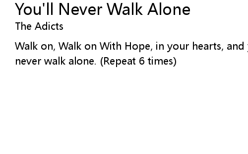 Walk on, Walk on With Hope, in your hearts, and you'll never walk alone, you'll never walk alone. (Repeat 6 times)