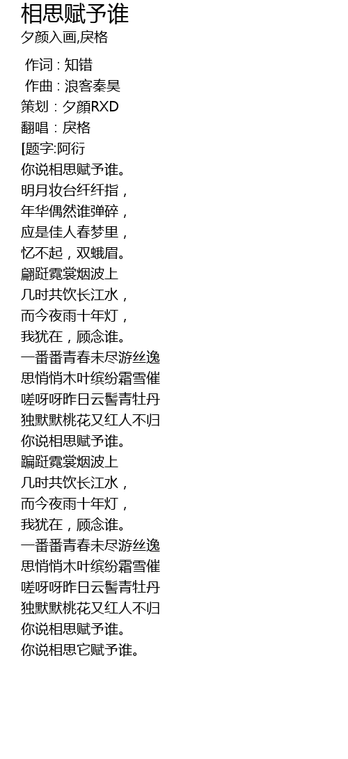 | [00:08.196] | nǐ shuō xiāng sī fù yǔ shuí. |