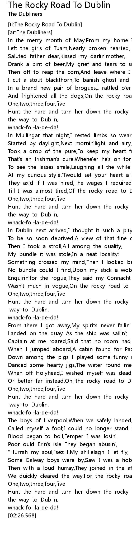 [01:48.884] Or better far instead,On the rocky road to Dublin.
