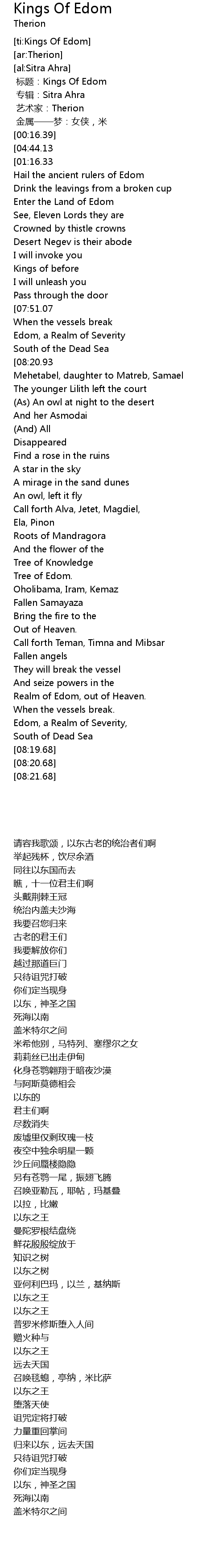 | [00:19.39] | Hail the ancient rulers of Edom |
