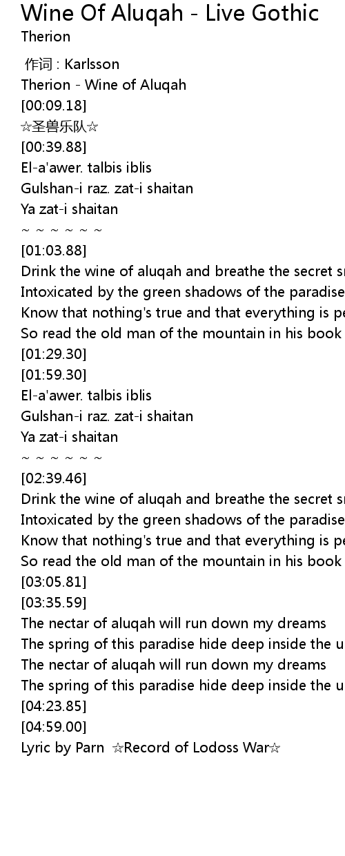 | [02:40.09] | Drink the wine of aluqah and breathe the secret smoke of god |