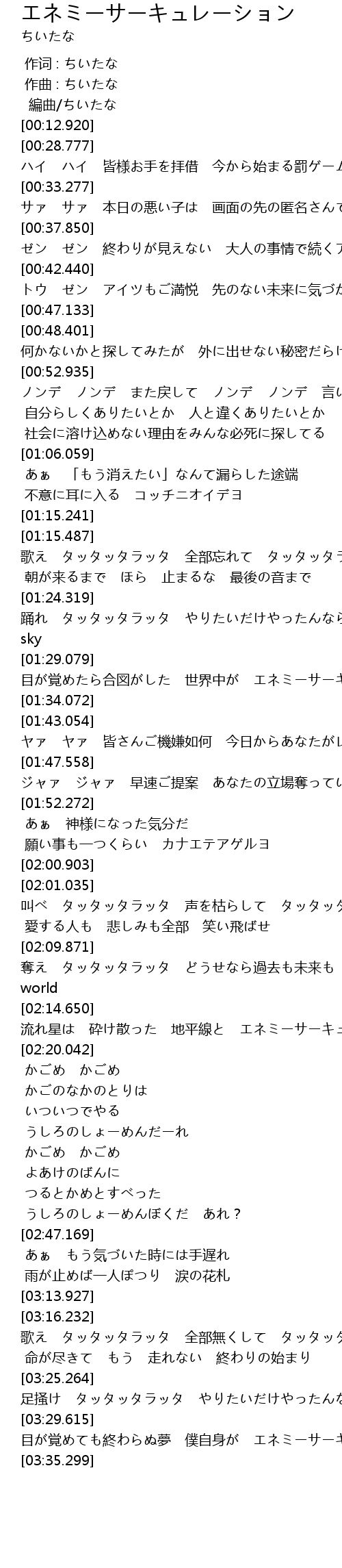 | [03:29.615] | 目が覚めても終わらぬ夢 僕自身が エネミーサーキュレーション |