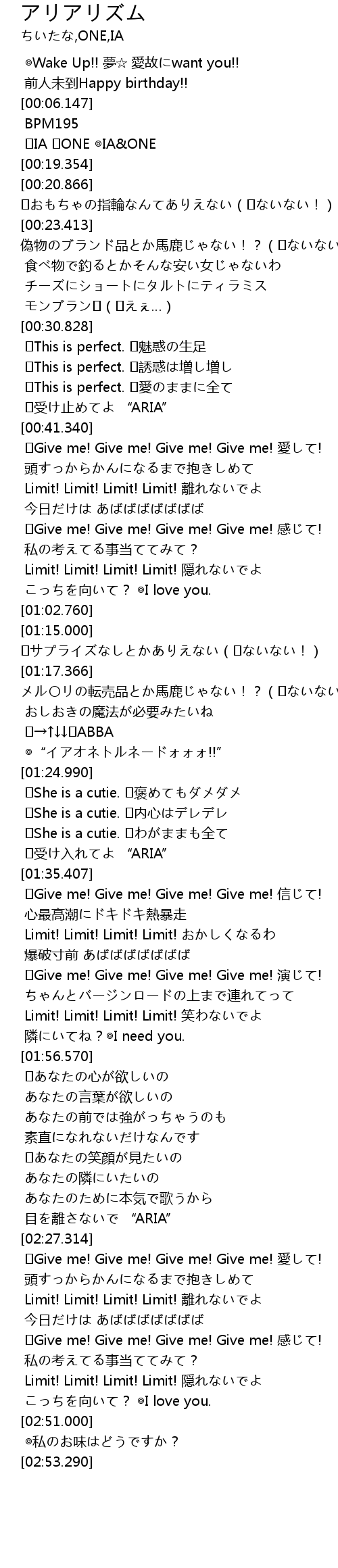 | [02:41.217] | ♢Give me! Give me! Give me! Give me! 感じて! |