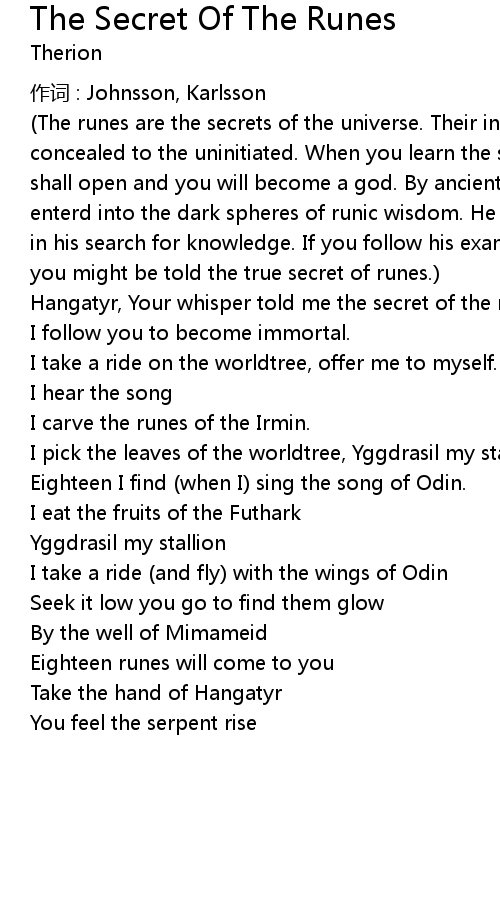 | (The runes are the secrets of the universe. Their inner meaning is hidden and concealed to the uninitiated. When you learn the secret of the runes your eyes shall open and you will become a god. By ancient techniques of ecstasy Odin enterd into the dark spheres of runic wisdom. He sacrificed himself to himself in his search for knowledge. If you follow his example and enter the way of Odin you might be told the true secret of runes.) | |