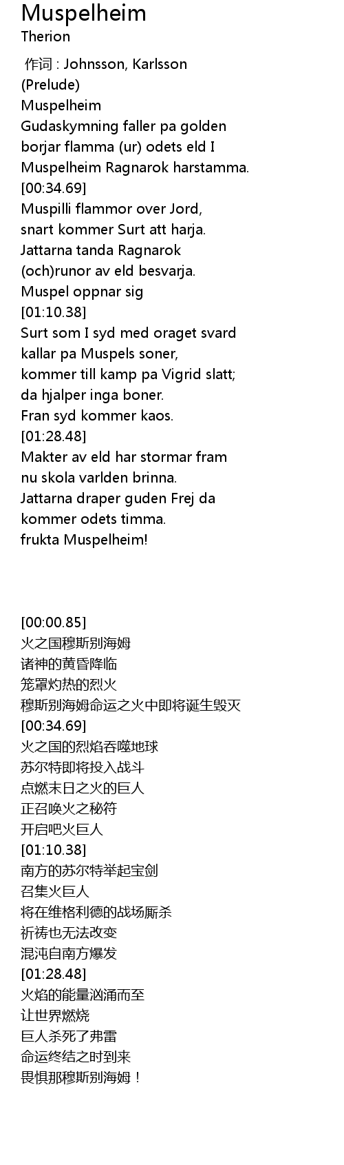 | [00:28.48] | Muspelheim Ragnarok harstamma. |