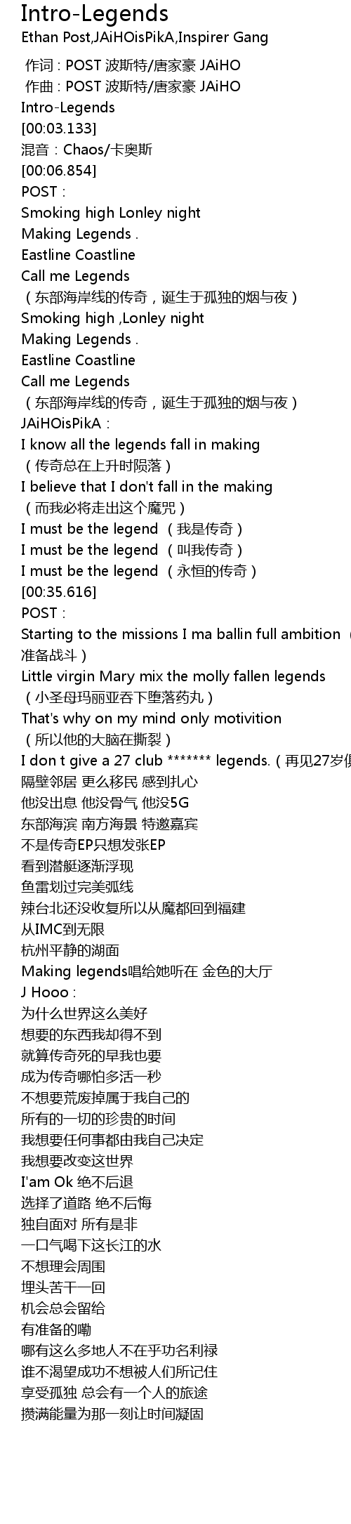 | [00:33.178] | I must be the legend yǒng héng de chuán qí |