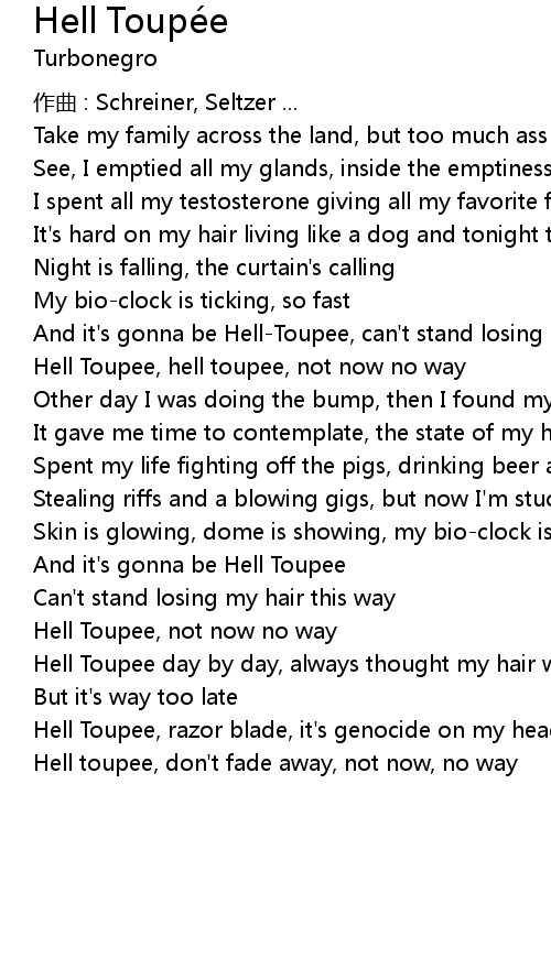 | And it' s gonna be HellToupee, can' t stand losing my hair this way | |