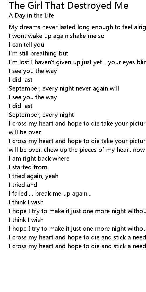 I cross my heart and hope to die take your picture from my mind and maybe this will be over. chew up the pieces of my heart now |