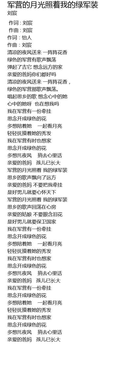 | [02:26.06] | 军营的月光照着 我的绿军装 |