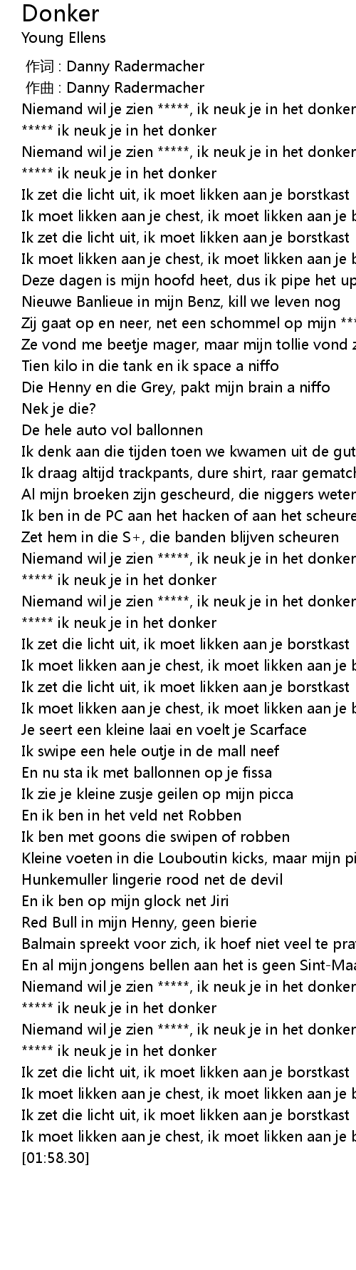 | [00:58.87] | Niemand wil je zien *****, ik neuk je in het donker |