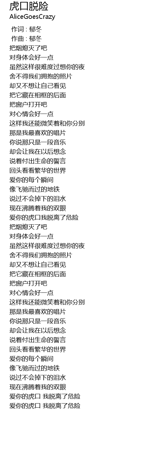 | [02:01.911] | ài nǐ de hǔ kǒu wǒ tuō lí le wēi xiǎn |