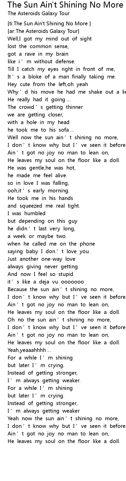 | [01:37.707] | Because the sun ain ’t shining no more, |