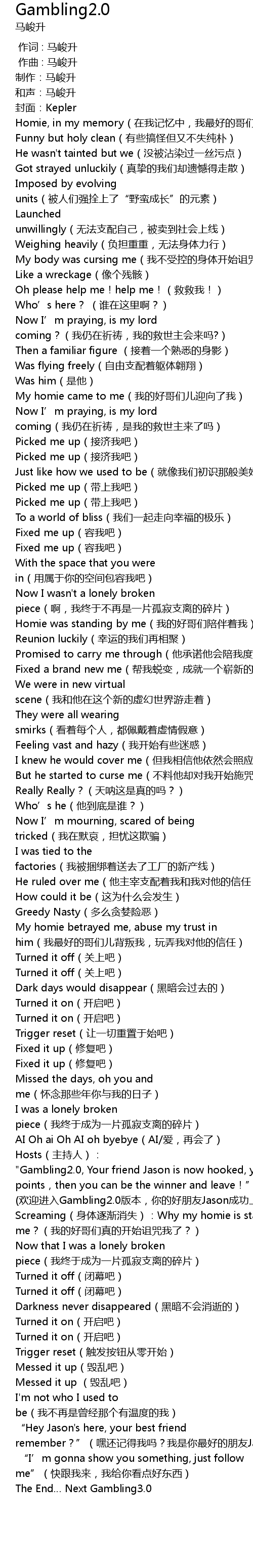 | [02:10.537] | " Gambling2. 0, Your friend Jason is now hooked, you still need 3 more points, then you can be the winner and leave!" huān yíng jìn rù Gambling2. 0 bǎn běn, nǐ de hǎo péng you Jason chéng gōng shàng gōu, nǐ hái chà 3 fēn jiù néng chéng wéi yíng jiā lí kāi |