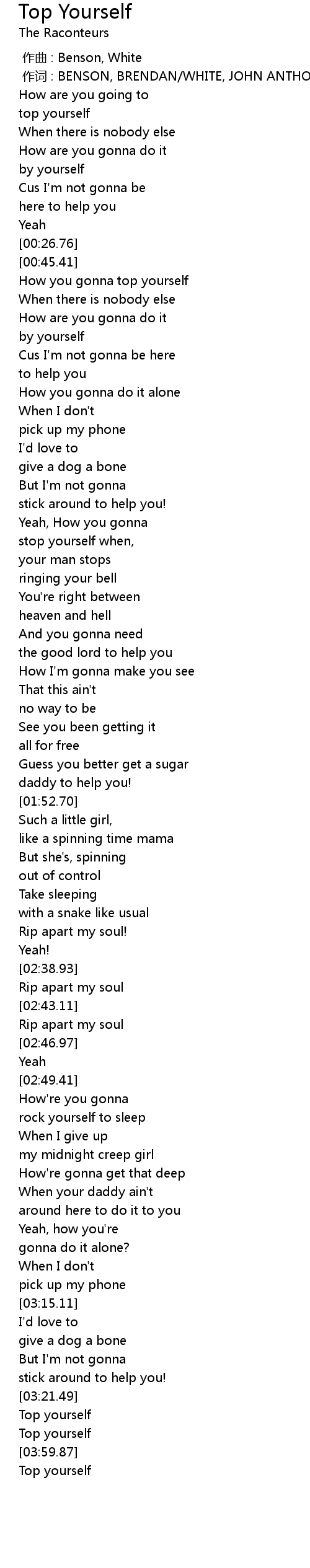 | [04:00.73] | Top yourself |
