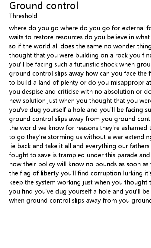 where do you go where do you go for external forces your body wakes but never waits to restore resources do you believe in what you do or is it just for money so if the world all does the same no wonder things are funny just when you thought that you were building on a rock you find you've dug yourself a hole and you'll be facing such a futuristic shock when ground control slips away from you ground control slips away how can you face the future do you create and generate to build a land of plenty or do you misappropriate until the world is empty do you despise and criticise with no absolution or do you stop to analyse to find a new solution just when you thought that you were building on a rock you find you've dug yourself a hole and you'll be facing such a futuristic shock when ground control slips away from you ground control slips away they're cutting up the world we know for reasons they're ashamed to show and all we love will have to go they're storming us without a war extending force until we fall while we lie back and take it all and everything our fathers made and everything they fought to save is trampled under this parade and nothing's going to stop them now their policy will know no bounds as soon as they control the ground under the flag of liberty you'll find corruption lurking it's our responsibility to keep the system working just when you thought that you were building on a rock you find you've dug yourself a hole and you'll be facing such a futuristic shock when ground control slips away from you ground control slips away
