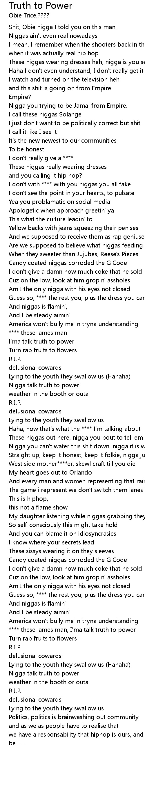 | [01:38.914] | Nigga talk truth to power |