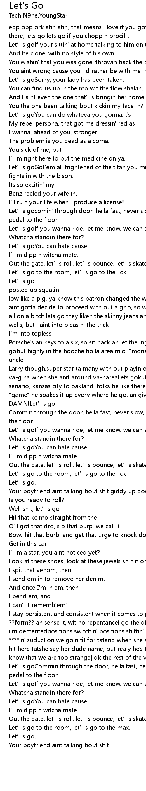 | Let' s goCommin through the door, hella fast, never slow, got the cash, and the pedal to the floor. | |