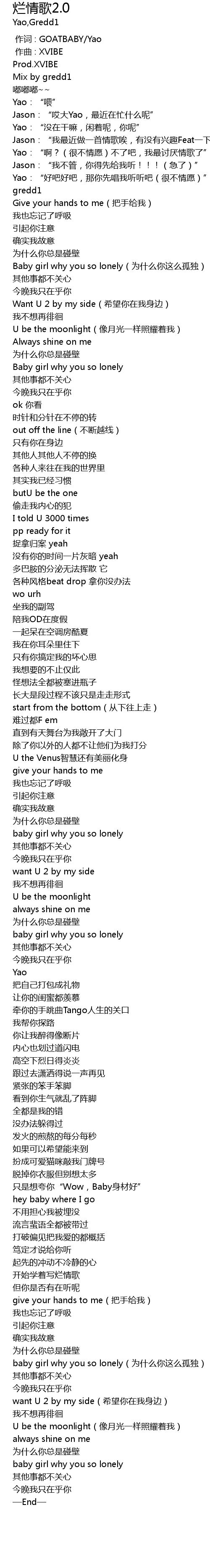 | [00:40.547] | Baby girl why you so lonely wèi shí me nǐ zhè me gū dú |