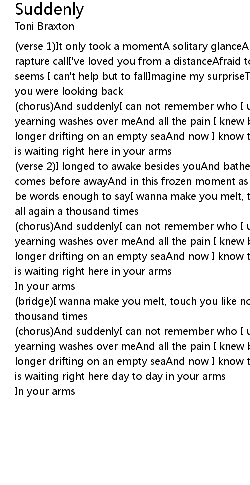 (chorus)And suddenlyI can not remember who I used to beAnd like the rain this yearning washes over meAnd all the pain I knew before is goneAnd suddenlyI'm no longer drifting on an empty seaAnd now I know that I believe in destinyAnd mine is waiting right here day to day in your arms |