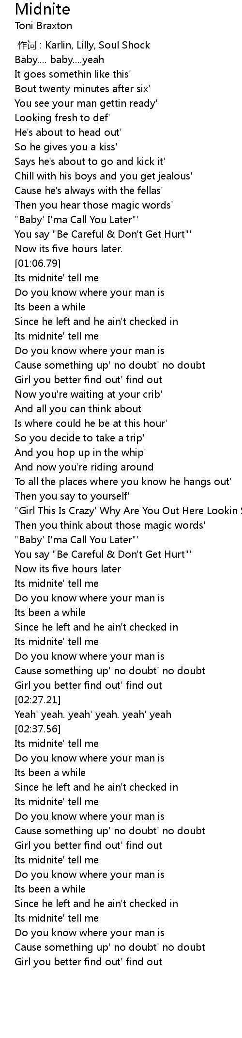 | [03:00.65] | Its midnite' tell me |