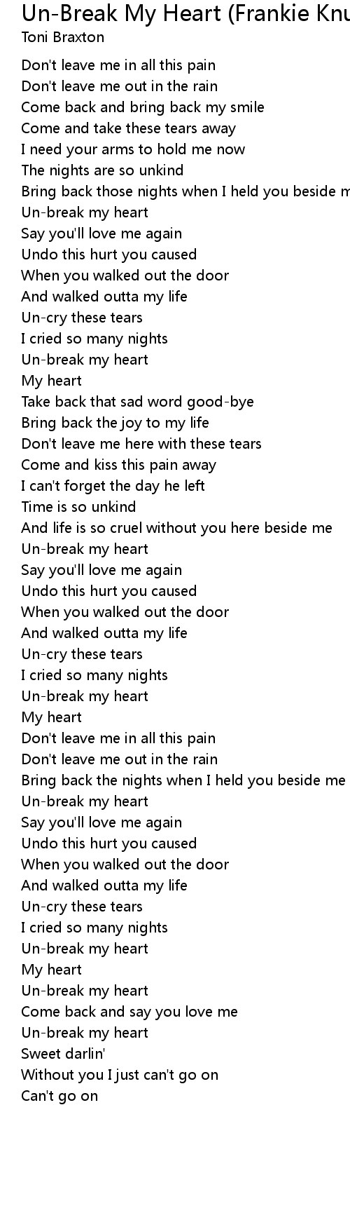 Un-Break My Heart (Frankie Knuckles Franktidrama Club Mix Edit) - Frankie Knuckles Franktidrama Club Mix Edit Lyrics
