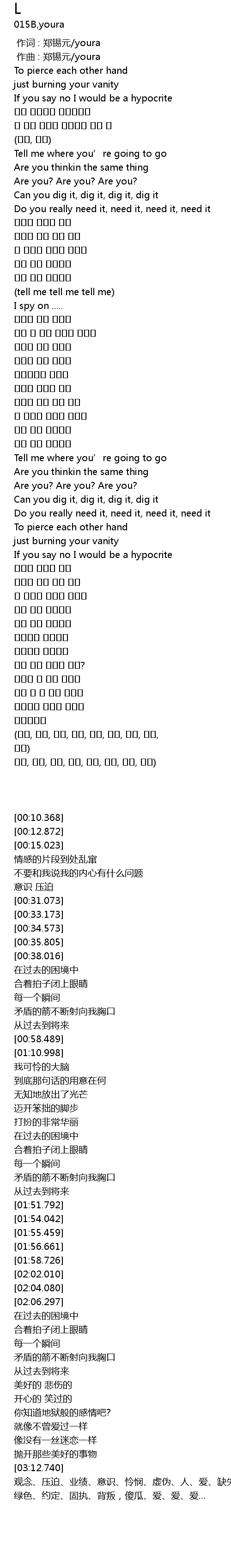 | [03:13.335] | (이념, 억압, 업보, 의식, 연민, 가식, 사람, 사랑, 부재) |