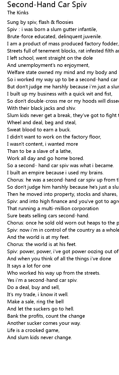 | Chorus: he was a second-hand car spiv up from the slums, | |
