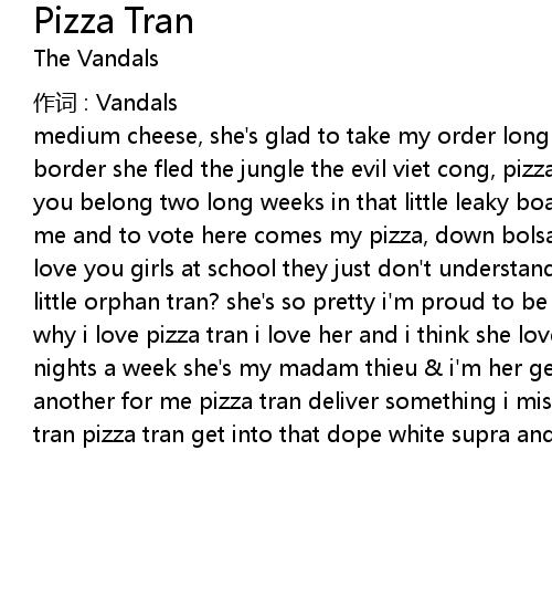 | medium cheese, she' s glad to take my order long long way from that laoviet border she fled the jungle the evil viet cong, pizza tran orange county is where you belong two long weeks in that little leaky boat just to get the right to see me and to vote here comes my pizza, down bolsa avenue, yes its true pizza tran i love you girls at school they just don' t understand what do you see in that little orphan tran? she' s so pretty i' m proud to be her man, and i am and that' s why i love pizza tran i love her and i think she loves me i order pizza ' bout 7 nights a week she' s my madam thieu i' m her general ky, i believe she' s baking another for me pizza tran deliver something i miss you and i' m so hungry pizza tran pizza tran get into that dope white supra and bring me a slice pizza tran |