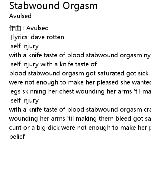 | music: furni 3 99 lyrics: dave rotten smooth and attractive no need aphrodisiac totally bisexual she already tasted it all chorus: self injury with a knife taste of blood stabwound orgasm nymphomaniac vaginal fury don' t care if he' s a man or a buxsom chick chorus: self injury with a knife taste of blood stabwound orgasm got saturated got sick of sex a juicy cunt or a big dick were not enough to make her pleased she wanted pain beyond belief cracking her legs skinning her chest wounding her arms ' til making them bleed nymphomaniac vaginal fury don' t care if he' s a man or a buxsom chick chorus: self injury with a knife taste of blood stabwound orgasm cracking her leg skinning her chest wounding her arms ' til making them bleed got saturated got sick of sex a juicy cunt or a big dick were not enough to make her pleased she wanted pain beyond belief |