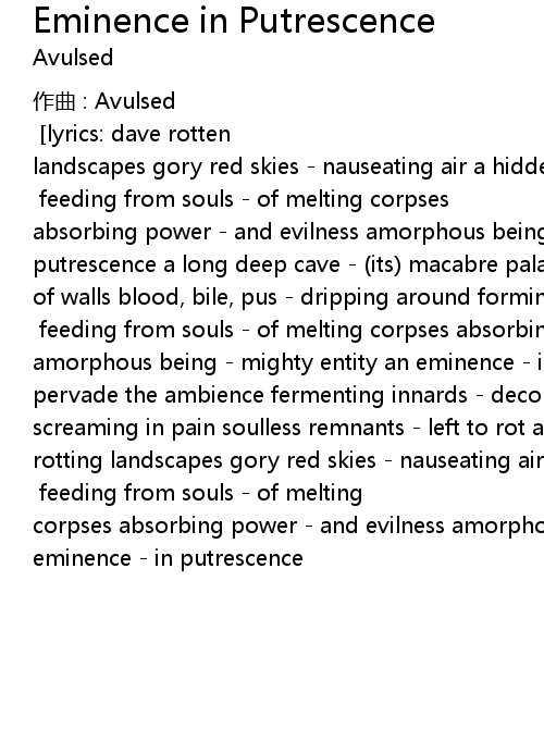 | [music: juancar 2/99] [lyrics: dave rotten] a realm of sickness - with rotting landscapes gory red skies - nauseating air a hidden hell - for tortured souls decomposition - is everywhere [chorus:] feeding from souls - of melting corpses absorbing power - and evilness amorphous being - mighty entity an eminence - in putrescence a long deep cave - (its) macabre palace bleeding cadavers - instead of walls blood, bile, pus - dripping around forming the river - of rottenness [chorus:] feeding from souls - of melting corpses absorbing power - and evilness amorphous being - mighty entity an eminence - in putrescence a putrid stench - pervade the ambience fermenting innards - decomposed limbs the twisted bodies - screaming in pain soulless remnants - left to rot a realm of sickness - with rotting landscapes gory red skies - nauseating air a hidden hell - for tortured souls decomposition - is everywhere [chorus:] feeding from souls - of melting corpses absorbing power - and evilness amorphous being - mighty entity an eminence - in putrescence |