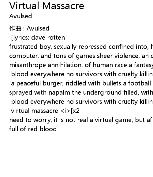 | music: furni 9 98 lyrics: dave rotten a perverse mind, with no remorse frustrated boy, sexually repressed confined into, his somber bedroom with a computer, and tons of games sheer violence, an obsession potential murder, fake misanthrope annihilation, of human race a fantasy, through the games prechorus blood everywhere no survivors with cruelty killing them all virtual massacre i x2 a peaceful burger, riddled with bullets a football stadium, sprayed with napalm the underground filled, with lethal gas a supermarket, blown away prechorus blood everywhere no survivors with cruelty killing them all virtual massacre i x2 virtual massacre i x2 nobody knows, his identity no need to worry, it is not real a virtual game, but after all he' s got his hands, full of red blood |