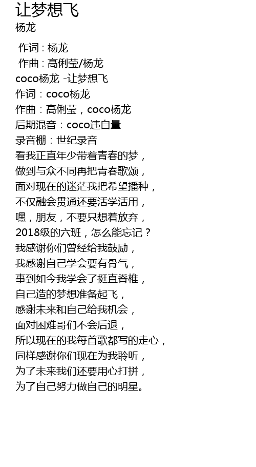 | [00:08.708] | coco杨龙 -让梦想飞 |
