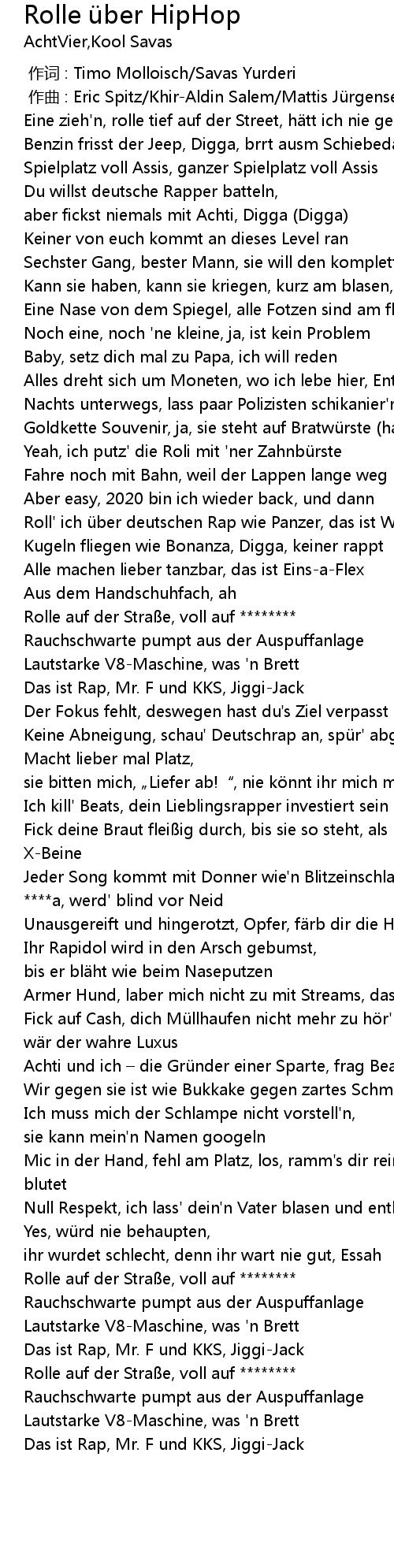 | [02:09.82] | Rolle auf der Straße, voll auf ******** |