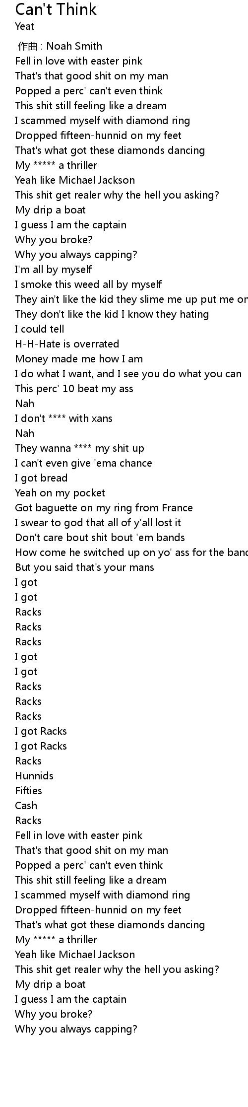 | [01:36.032] | Popped a perc' can' t even think |