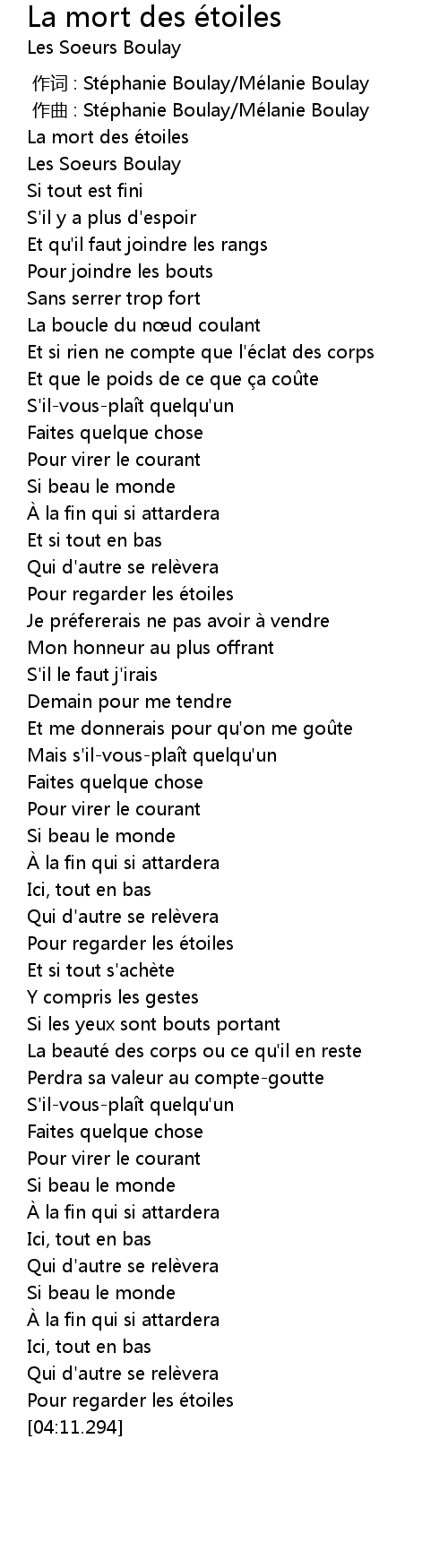 | [00:00.000] | 作词 : Stéphanie Boulay/Mélanie Boulay |