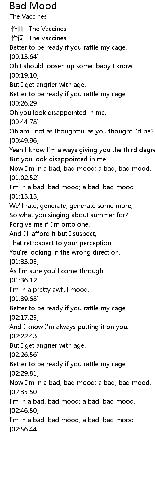 | [02:50.31] | I'm in a bad, bad mood; a bad, bad mood. |