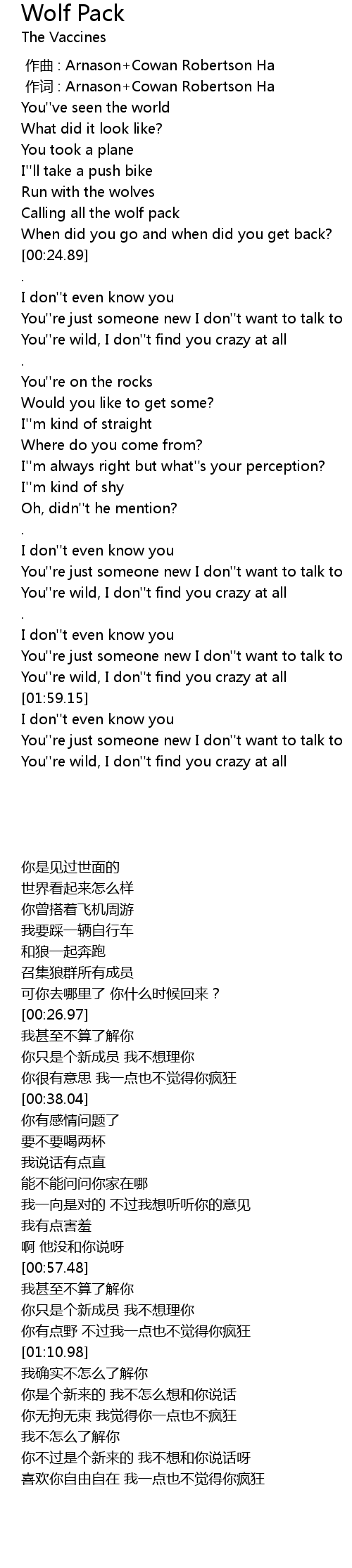 | [00:18.38] | Calling all the wolf pack |
