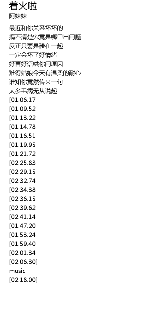 | [03:28.84][01:09.52] | wǒ kuài yào zhe zhe zhe zhe zháo huǒ la |
